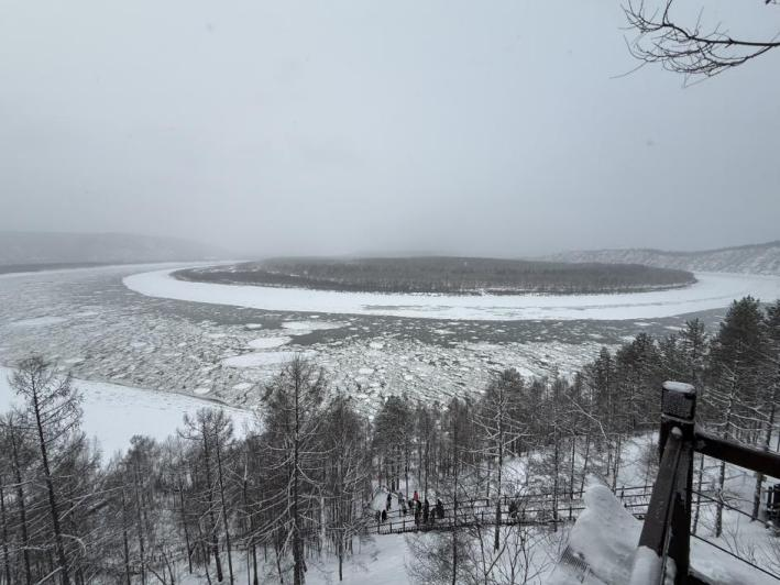 今天的最后一站是龍江第一灣。到達景點游客服務(wù)中心后,我們乘坐景點大巴前往景區(qū),攀爬積雪中1000多步臺階的棧道。到達山頂,俯瞰那Ω形江道中冰雪的涌動,非常震撼,美不勝收,也是此行最為壯美的自然景象(江面結(jié)冰就看不到這種景色)。接著再下棧道,讓我們深切感受此時的“有氣無力”和“上山容易下山難”,只有老老實實手握護手,小心翼翼下山。
