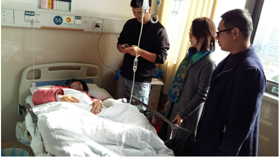 走進(jìn)病房,看到的是肖雪芳正躺在病床上輸液,架子上還有數(shù)袋需要輸。在與家屬的溝通中基本了解了她的病情和治療情況。工程技術(shù)部經(jīng)理謝明親切的叮囑她要安心治療,養(yǎng)好身體,保持良好的心態(tài),最后帶上公司同事的祝福,祝她早日康復(fù)!