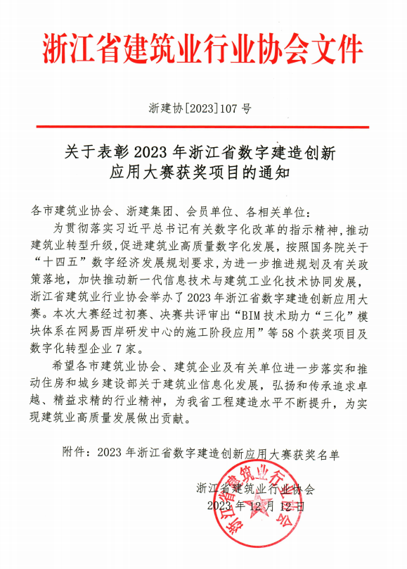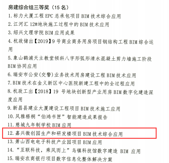 浙江省建筑業(yè)行業(yè)協(xié)會(huì)發(fā)布的《關(guān)于表彰2023年浙江省數(shù)字建造創(chuàng)新應(yīng)用大賽獲獎(jiǎng)項(xiàng)目的通知》,由我司監(jiān)理的嘉興微創(chuàng)園生產(chǎn)和研發(fā)樓項(xiàng)目BIM技術(shù)綜合應(yīng)用獲得房建綜合組三等獎(jiǎng)。