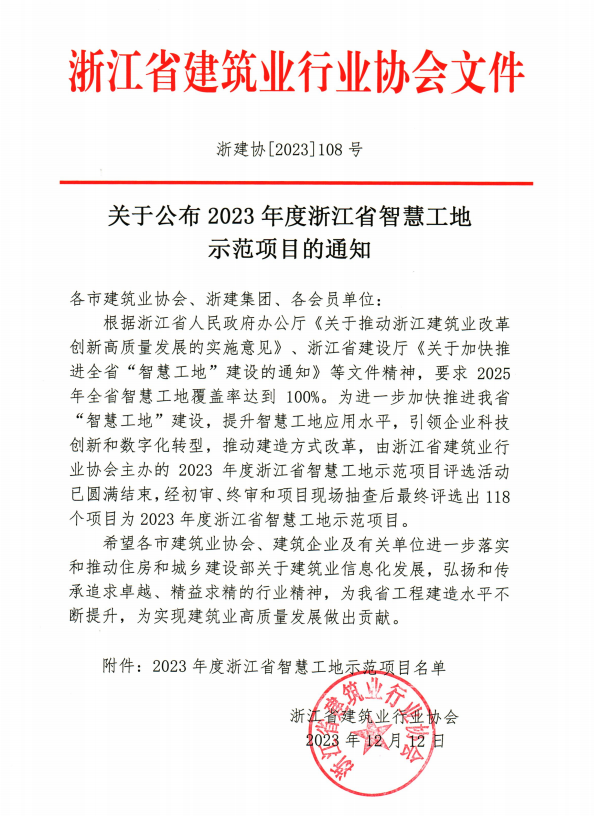 近日,浙江省建筑業(yè)行業(yè)協(xié)會(huì)發(fā)布《關(guān)于公布2023年度浙江省智慧工地示范項(xiàng)目的通知》,由我司監(jiān)理的海鹽縣康體活動(dòng)中心(全民健身中心)、桐鄉(xiāng)市鳳凰湖科技城研發(fā)社區(qū)中心項(xiàng)目一期(A區(qū))、嘉興國(guó)際金融廣場(chǎng)二期5號(hào)地塊工程三個(gè)項(xiàng)目獲評(píng)2023年度浙江省智慧工地示范項(xiàng)目。